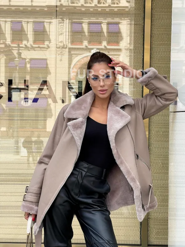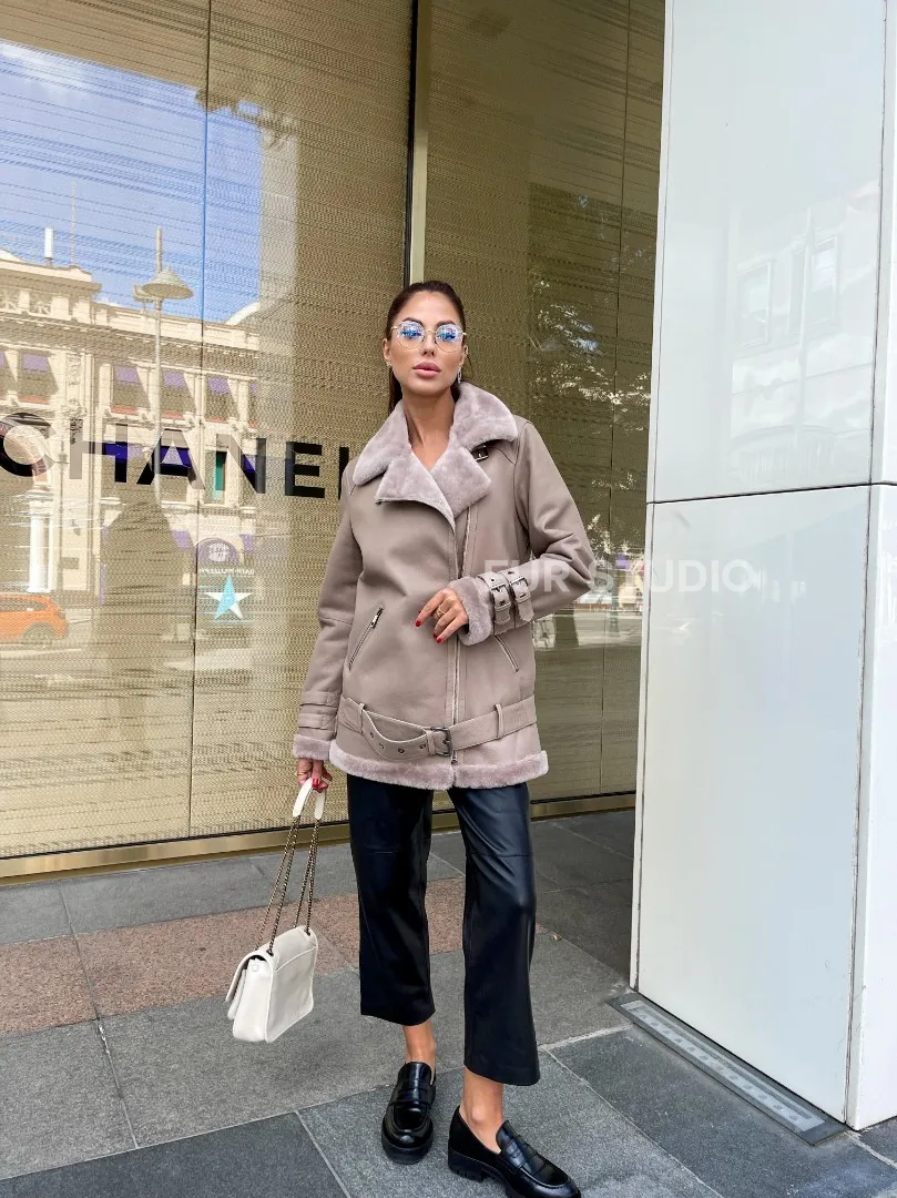Авиатор дубленка из натуральной овчины в бежевом оттенке 100280