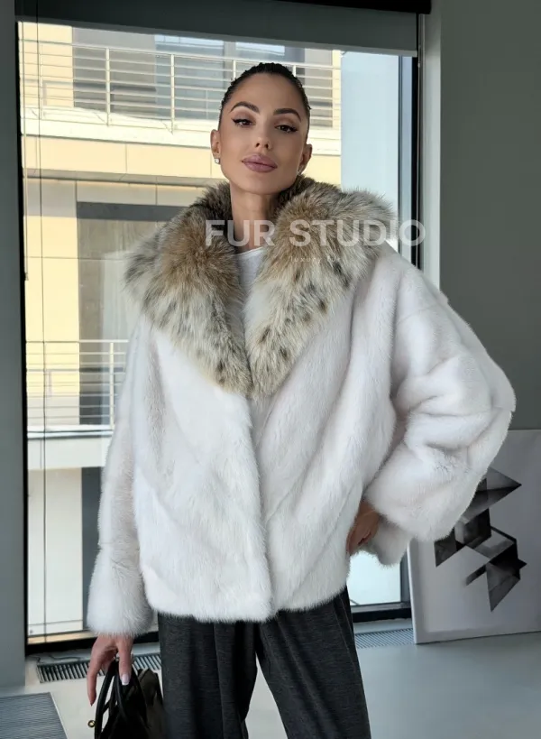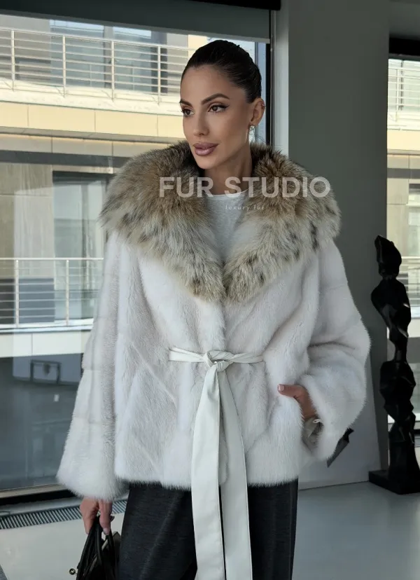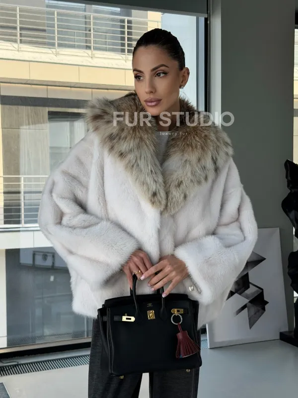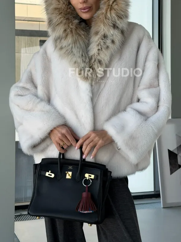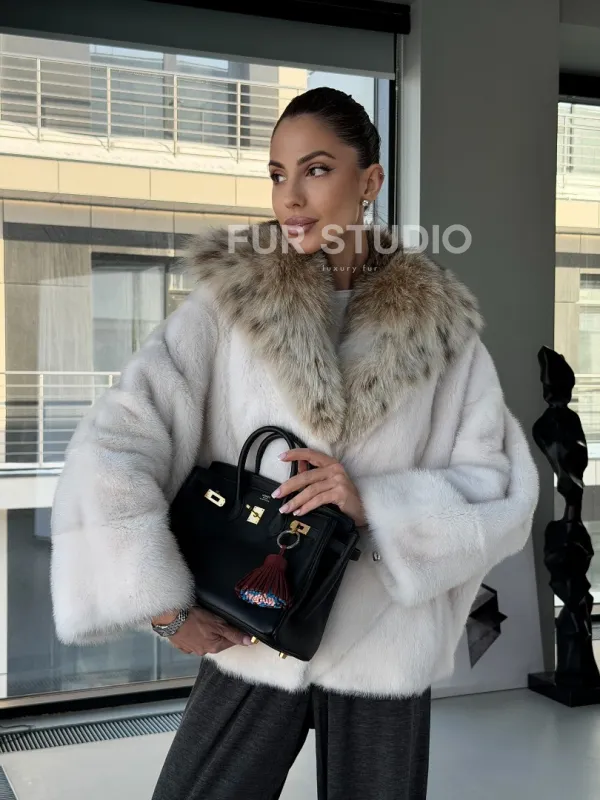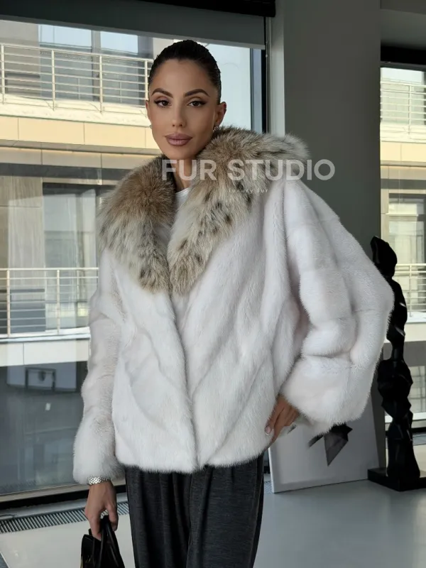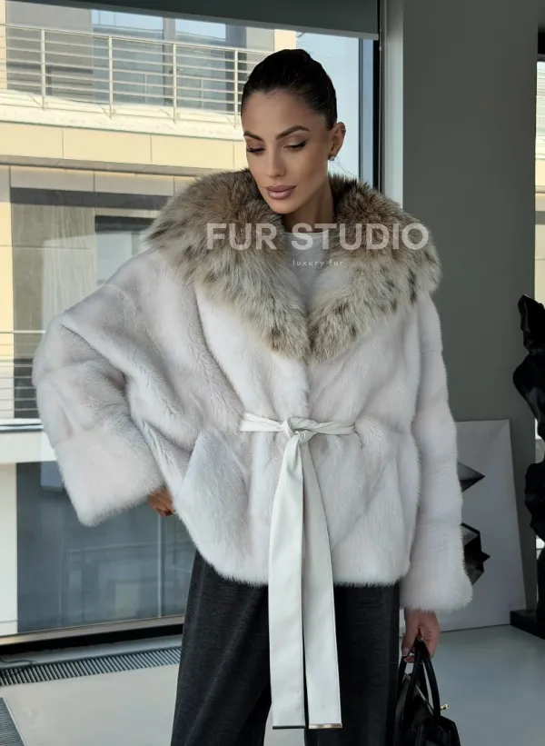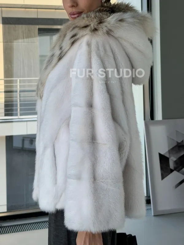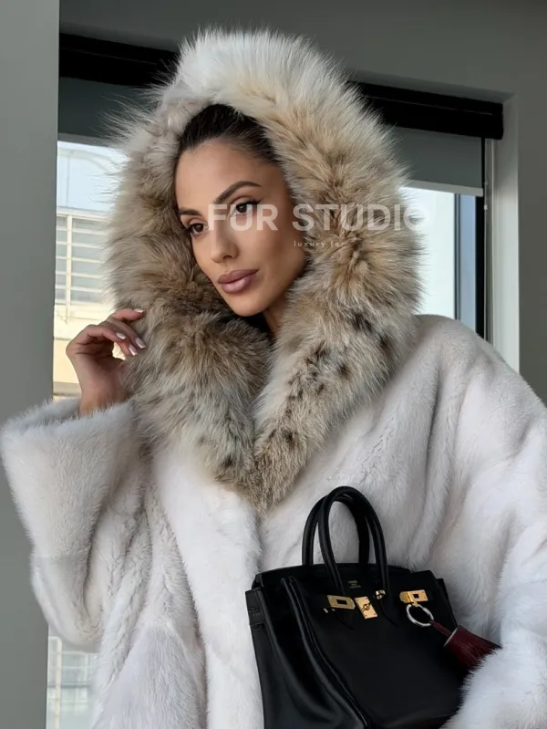 Белое норковое манто с капюшоном из меха рыси – выбор девушек, которые готовы экспериментировать. Летучка сделает ваш образ легким и воздушным. Необычный цвет напомнит о лете и освежит ваш стиль. Нежный мех бережно согреет владелицу в любые холода. Шикарный капюшон из рыси позаботится, чтобы волосы были в тепле.