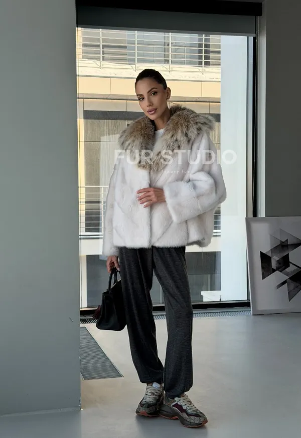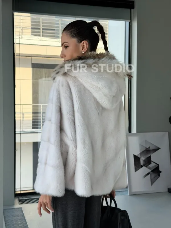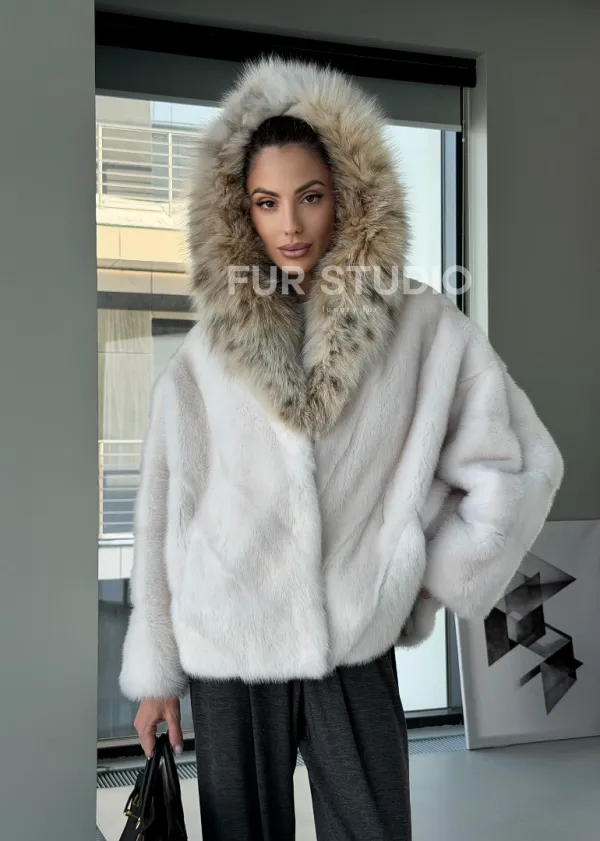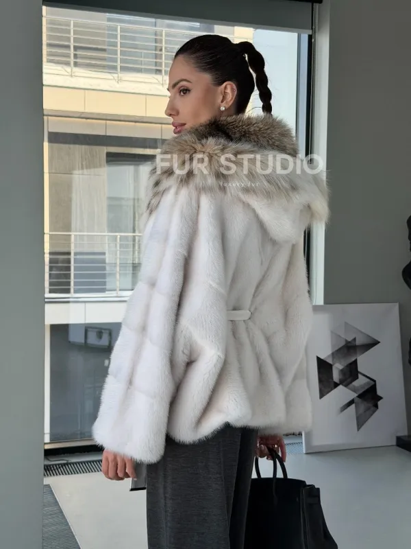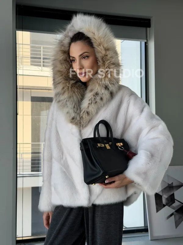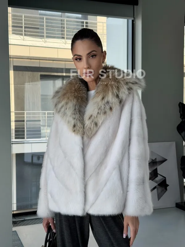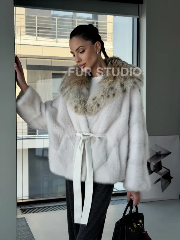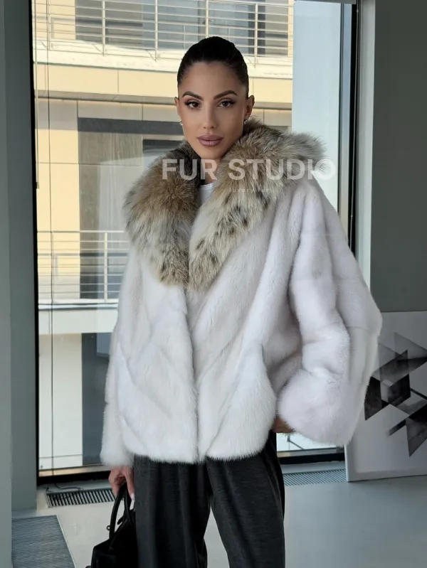 Белое норковое манто с капюшоном из меха рыси – выбор девушек, которые готовы экспериментировать. Летучка сделает ваш образ легким и воздушным. Необычный цвет напомнит о лете и освежит ваш стиль. Нежный мех бережно согреет владелицу в любые холода. Шикарный капюшон из рыси позаботится, чтобы волосы были в тепле.