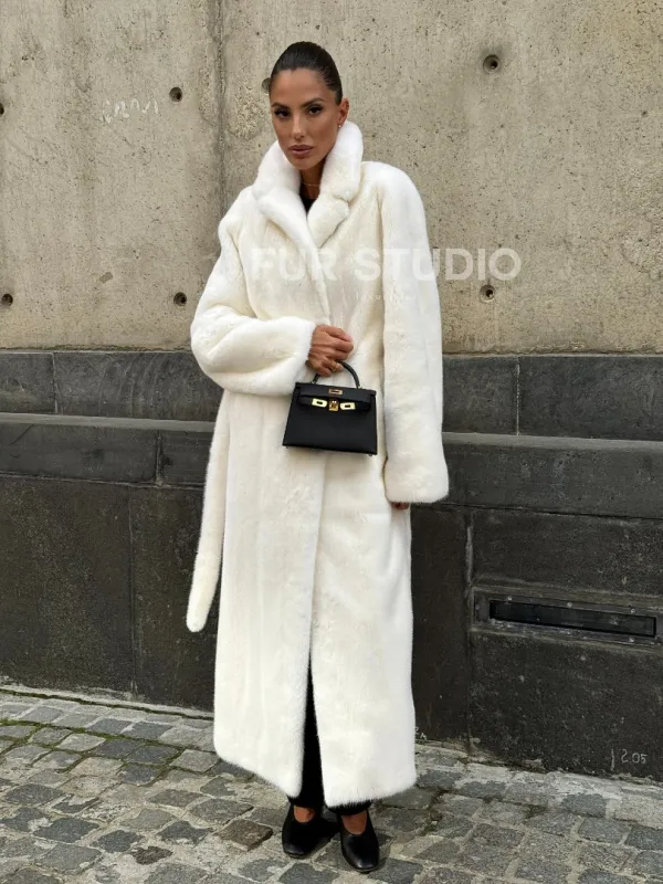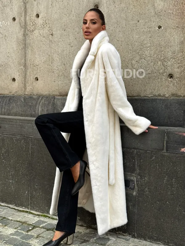 Роскошные рукава добавляют изысканности модели. Шикарные карманы позаботятся о комфорте ручек. Миниатюрная сумочка и грубая обувь сделают ваш образ гармоничным. Качество изделия будет радовать многие годы. Купить белую шубу из плюшевой норки с английским воротником могут дамы, которые обладают безукоризненным вкусом стиля.