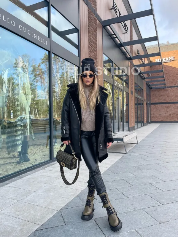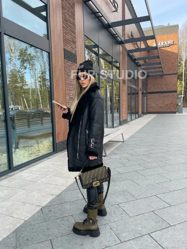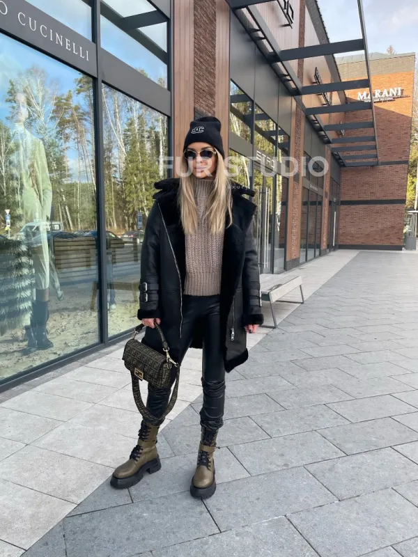 Дубленка авиатор удлиненная – тренд этого года. Модель прекрасно подходит всем девушкам вне зависимости от их возраста и типа фигуры. Удлиненное изделие зрительно увеличивает рост владелицы и скрывает недостатки силуэта. Шикарный воротник позаботится о комфорте шеи. Теплая подкладка не даст замерзнуть в холодную зиму. Ремешки на рукавах делают образ экстравагантным.