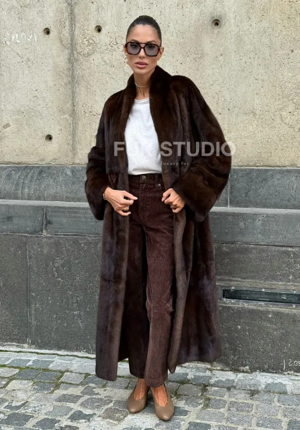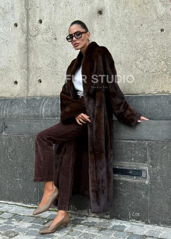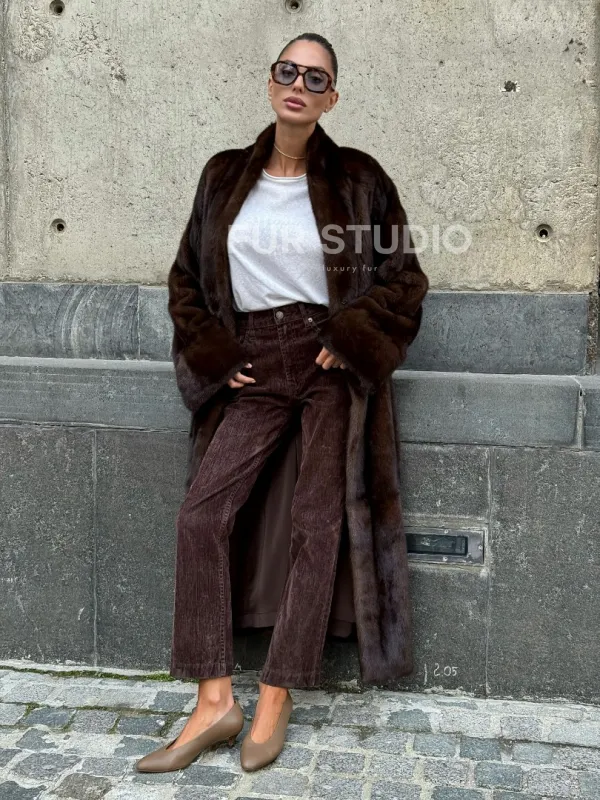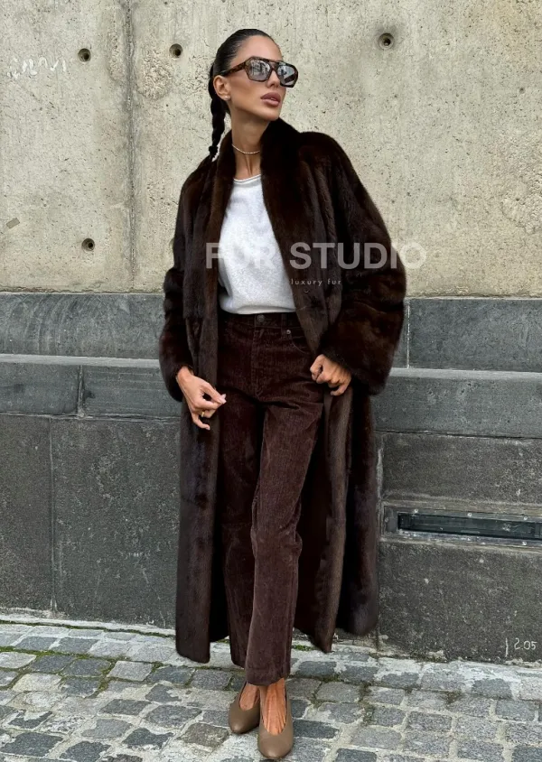 Мех данной шубы аукционная норка, цвет коричневый. Предлагается в размерах от 42 до 48 (инд.пошив от 50 до 64). Длина модели 125-130 см, что выгодно подчеркивает фигуру девушек. Эта модель идеально подойдет для девушек и женщин, предпочитающих роскошные натуральные меха.
