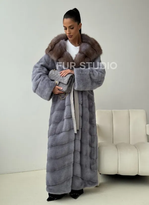 Мех данной шубы аукционная норка, цвет голубой. Предлагается в размерах от 42 до 48 (oversize). Длина модели 135-140 см, что выгодно подчеркивает фигуру девушек. Эта модель идеально подойдет для девушек и женщин, предпочитающих роскошные натуральные меха.