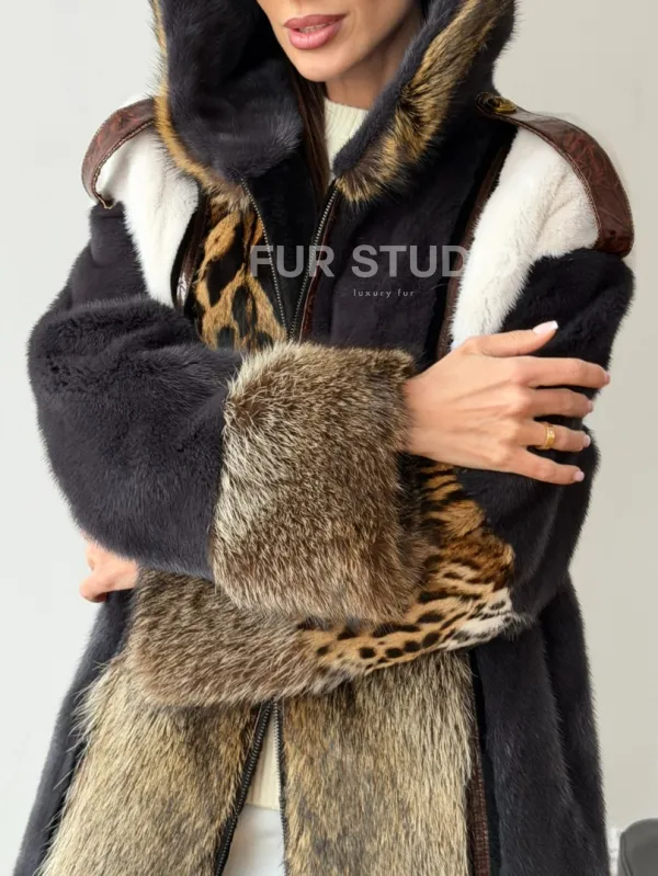 Комбинированная норковая шуба с капюшоном доступна для покупки в нашем шоуруме Furs Studio в . У нас так же есть доставка во все города России. Добавьте немного роскоши в свой гардероб с этой шубой, которая будет служить вам многие годы.