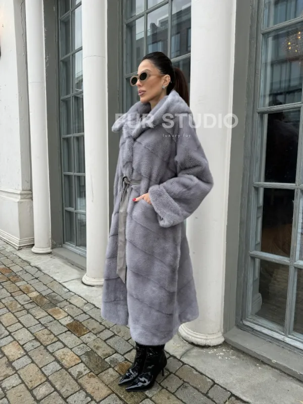 Мех данной шубы аукционная норка, цвет серый. Предлагается в размерах от 42 до 54. Длина модели 110-115 см, что выгодно подчеркивает фигуру девушек. Эта модель идеально подойдет для девушек и женщин, предпочитающих роскошные натуральные меха.