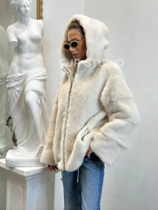 Норковая куртка с капюшоном - цвет ваниль 100797