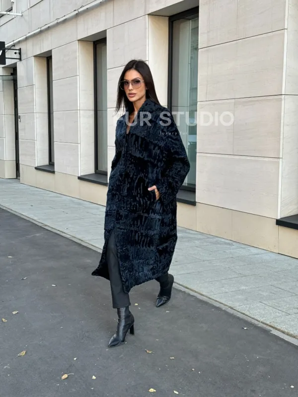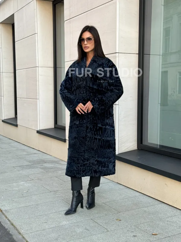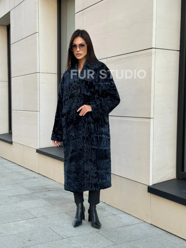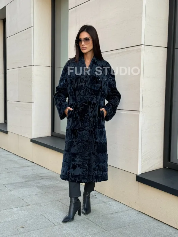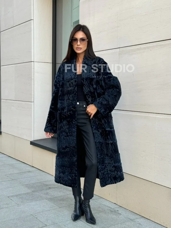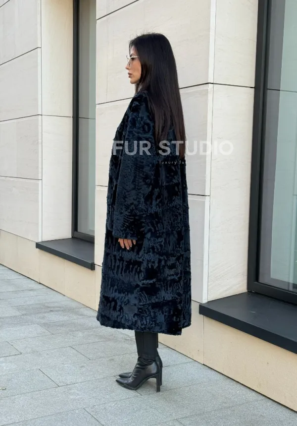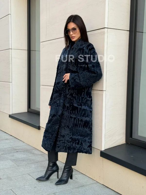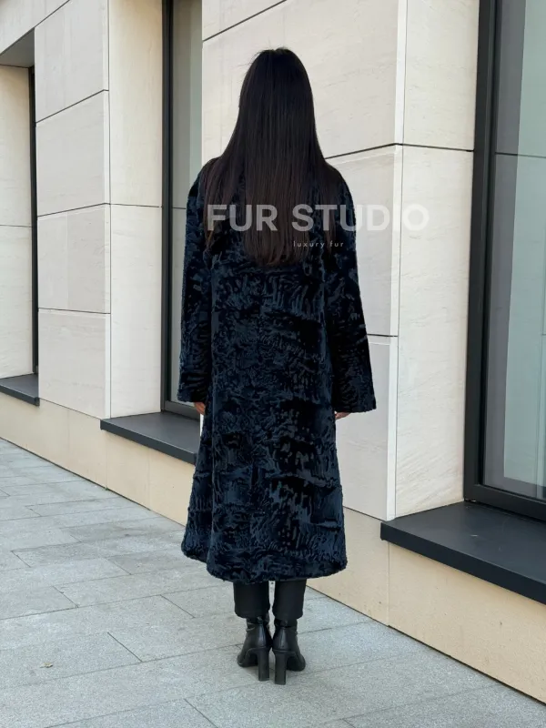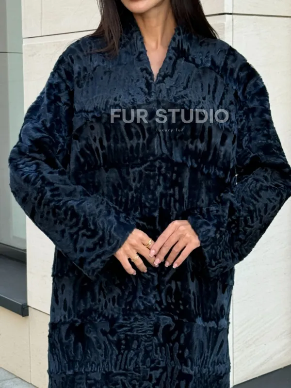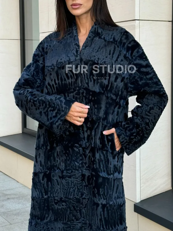Пальто из меха каракуля с V-образным воротником, цвет Indigo Blue 101118