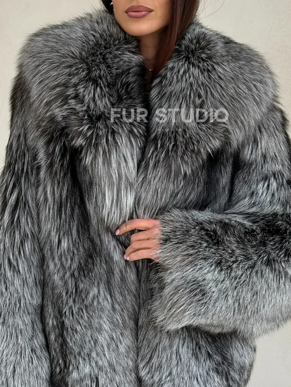 Мех данной шубы лиса, цвет серый. Предлагается в размерах от 42 до 48. Длина модели 65-70 см, что выгодно подчеркивает фигуру девушек. Эта модель идеально подойдет для девушек и женщин, предпочитающих роскошные натуральные меха.