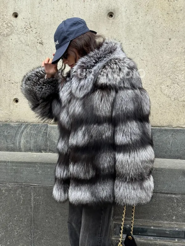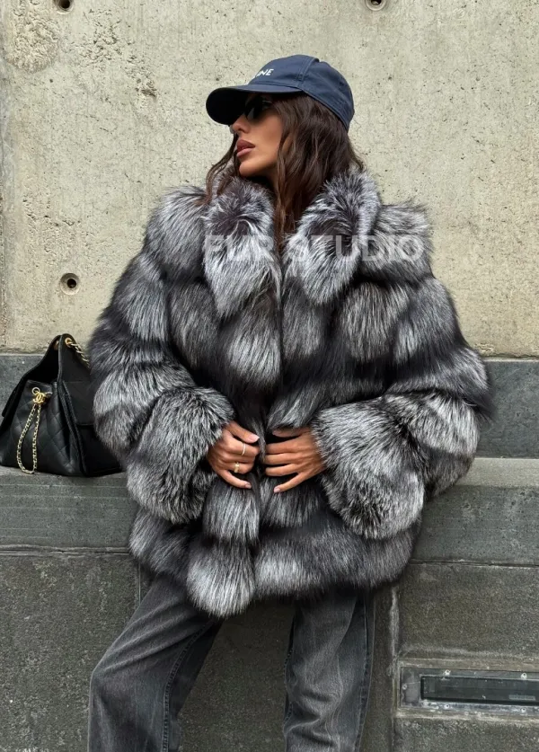 Мех данной шубы лиса, цвет серый. Предлагается в размерах от 42 до 50. Длина модели 65-70 см, что выгодно подчеркивает фигуру девушек. Эта модель идеально подойдет для девушек и женщин, предпочитающих роскошные натуральные меха.