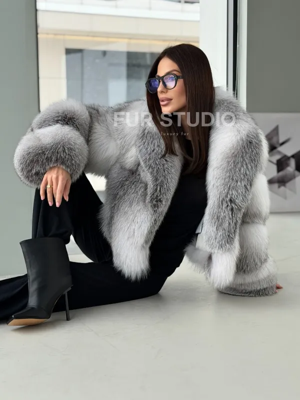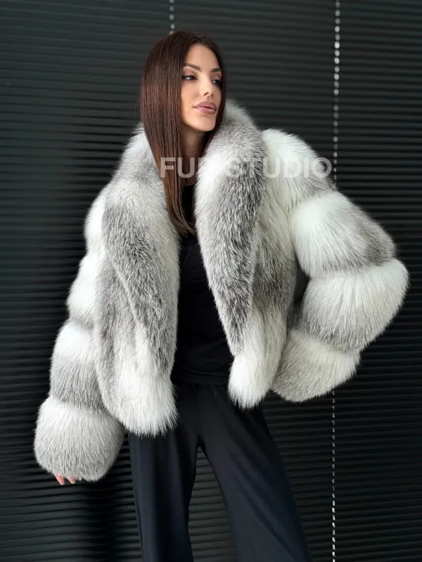 Мех данной шубы лиса, цвет белый. Предлагается в размерах от 42 до 50. Длина модели 55-60 см, что выгодно подчеркивает фигуру девушек. Эта модель идеально подойдет для девушек и женщин, предпочитающих роскошные натуральные меха.
