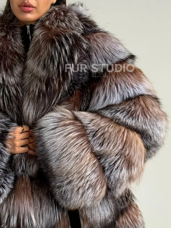 Мех данной шубы лиса, цвет серый. Предлагается в размерах от 42 до 50. Длина модели 65-70 см, что выгодно подчеркивает фигуру девушек. Эта модель идеально подойдет для девушек и женщин, предпочитающих роскошные натуральные меха.