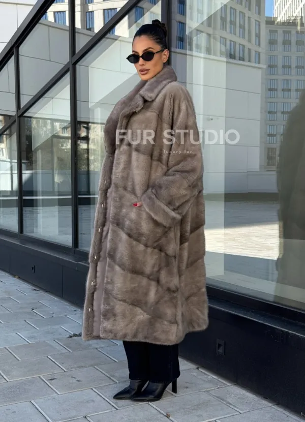 Мех данной шубы аукционная норка, цвет серый. Предлагается в размерах от 42 до 66. Длина модели 115-120 см, что выгодно подчеркивает фигуру девушек. Эта модель идеально подойдет для девушек и женщин, предпочитающих роскошные натуральные меха.
