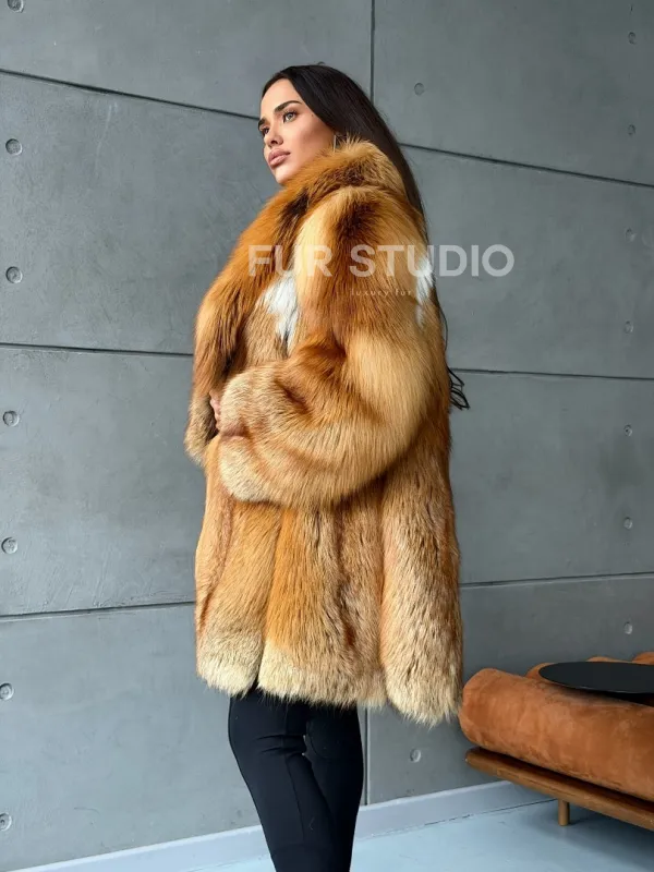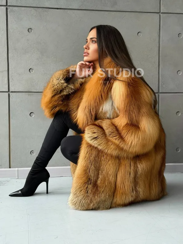 Мех данной шубы лиса, цвет рыжий. Предлагается в размерах от 40 до 52. Длина модели 80-85 см, что выгодно подчеркивает фигуру девушек. Эта модель идеально подойдет для девушек и женщин, предпочитающих роскошные натуральные меха.