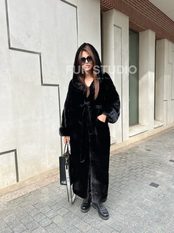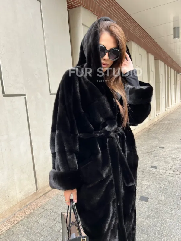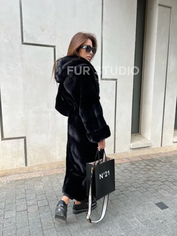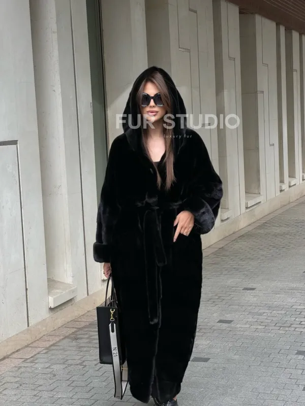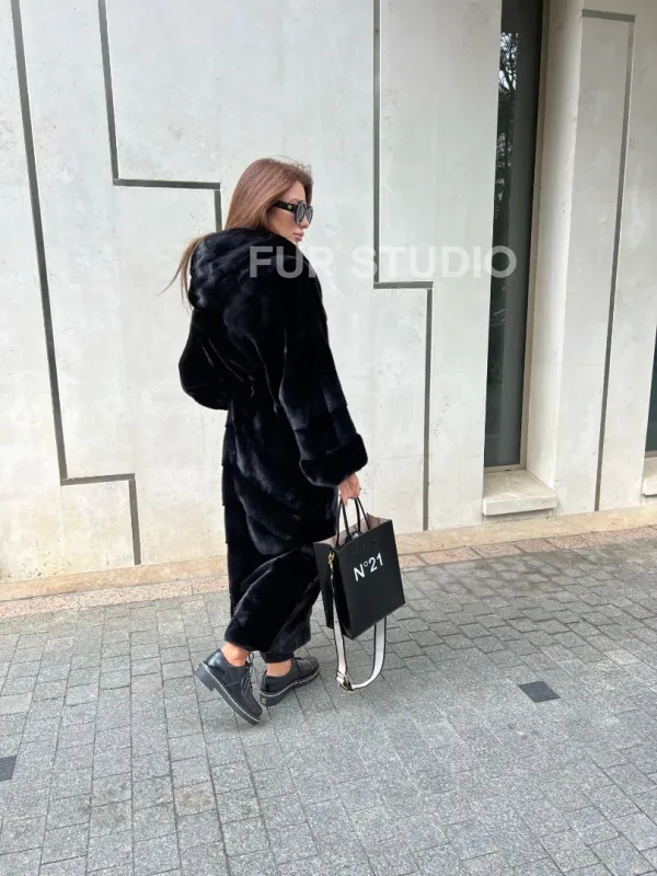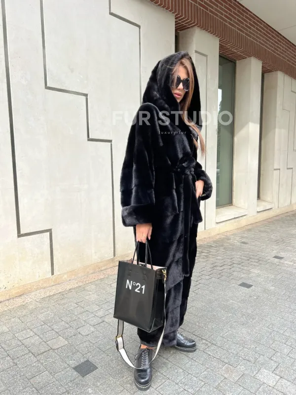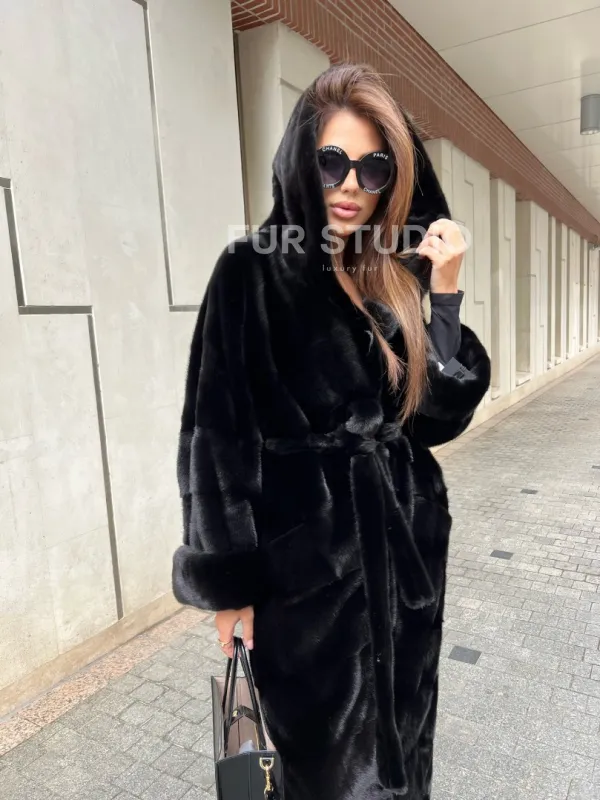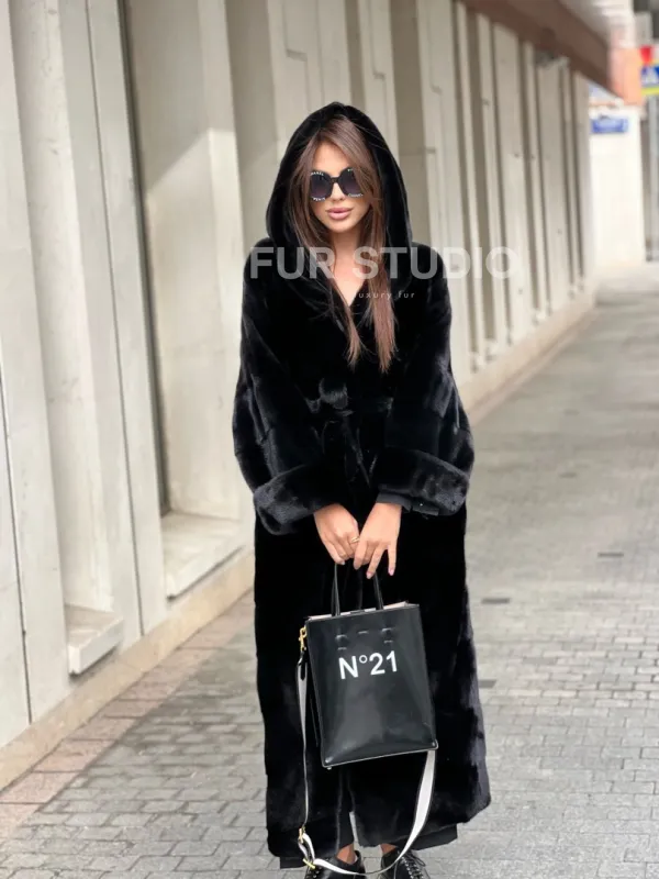 Шуба из норки Velvet с капюшоном в черном цвете 100248