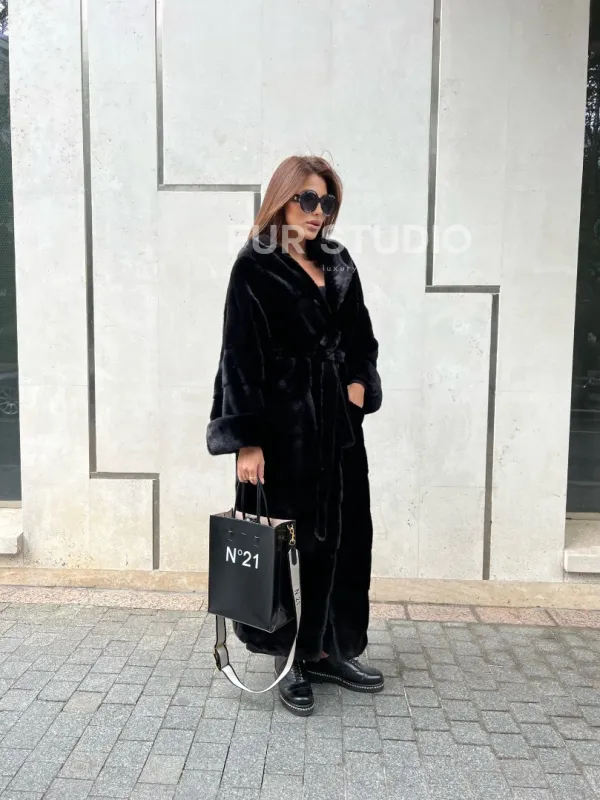 Шуба из норки Velvet с капюшоном в черном цвете - длинная модель согреет в любой холод. Прямой свободный силуэт не сковывает движение, зрительно увеличит рост. В изделии будете чувствовать себя комфортно. Большой воротник бережно защитит прическу от ветра, подчеркнет хрупкость владелицы. Пояс очертит изящную талию.