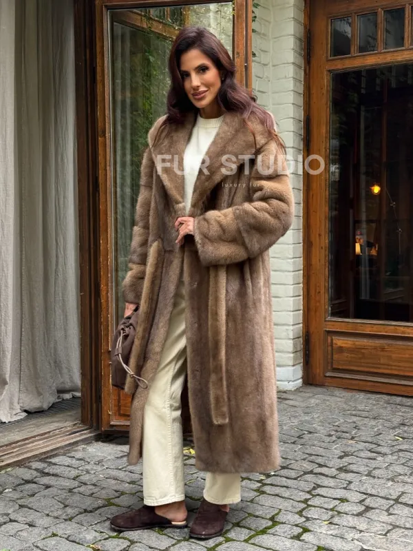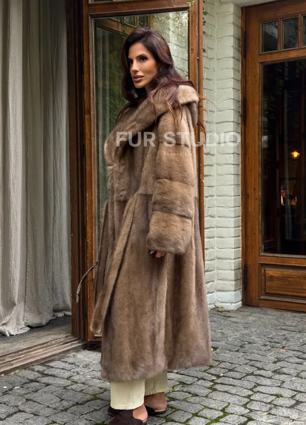 Мех данной шубы аукционная норка, цвет бежевый. Предлагается в размерах от 42 до 54. Длина модели 115-120 см, что выгодно подчеркивает фигуру девушек. Эта модель идеально подойдет для девушек и женщин, предпочитающих роскошные натуральные меха.