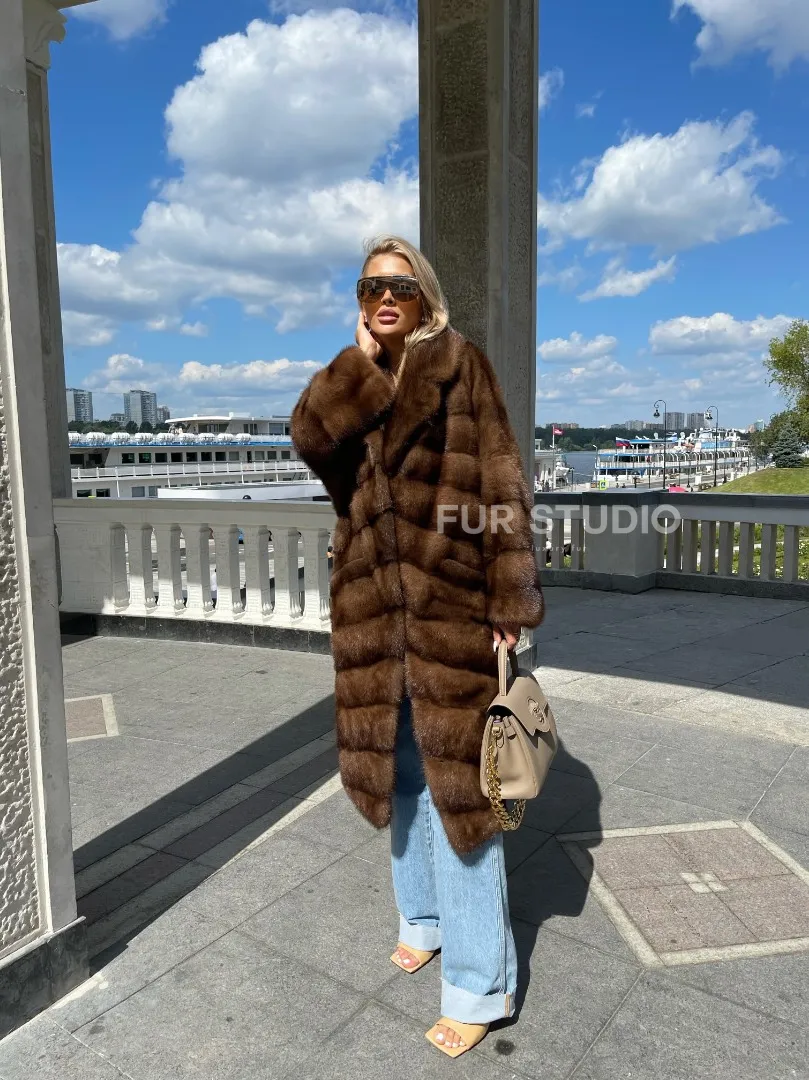 Модель гармонично сочетается с любым гардеробом от базового до вечерних туалетов. Длина изделия позволяет носить короткие вещи, что очень удобно в холодное время года. Прямой крой зрительно увеличит рост и скроет недостатки фигуры. Широкие рукава подчеркнут изящество кистей и не сковывают движение рук. Добавьте в образ статусную сумочку, и вы будете выглядеть дорого и изысканно. Купить удлиненную норковую шубу в цвете соболь могут женщины, которые знают толк в моде.
